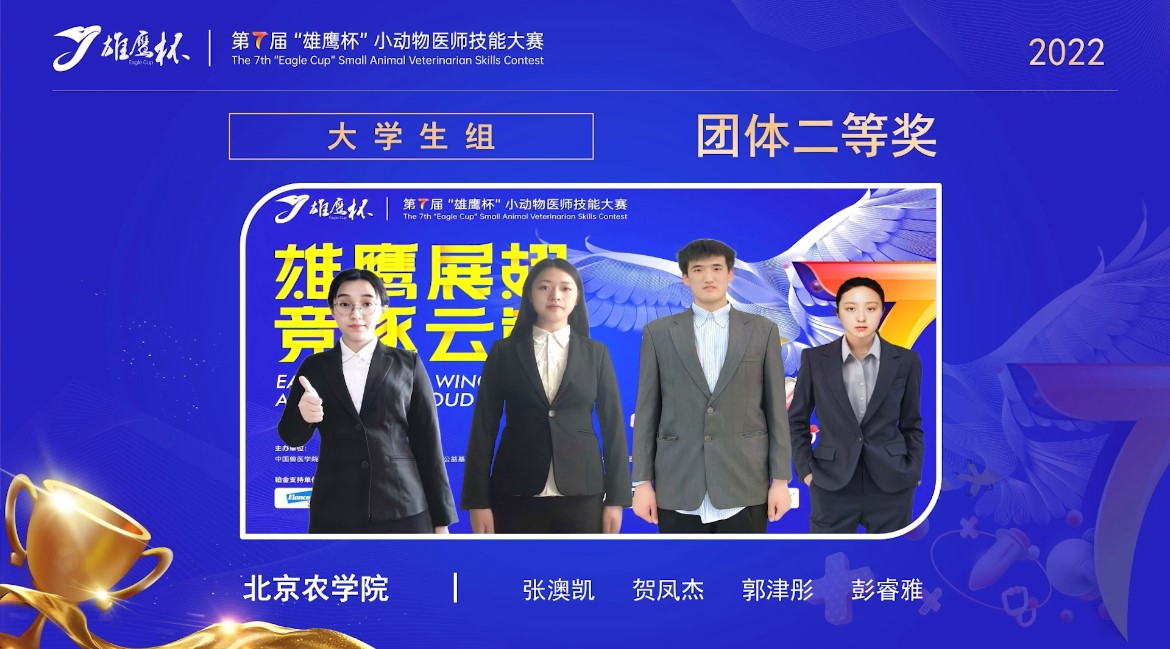 张澳凯、贺凤杰、郭津彤、彭睿雅4名参赛同学和张永红、姚华、王相国3名指导老师组成的代表队代表北京农学院参赛。在疫情防控形势下,北京农学院参赛队员经过理论考试,兔胃切开手术、血涂片制备与判读、徒手打结4个环节的比拼,最终荣获第七届“雄鹰杯”小动物医师技能大赛团体二等奖。