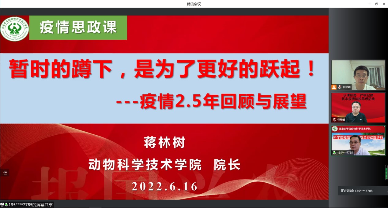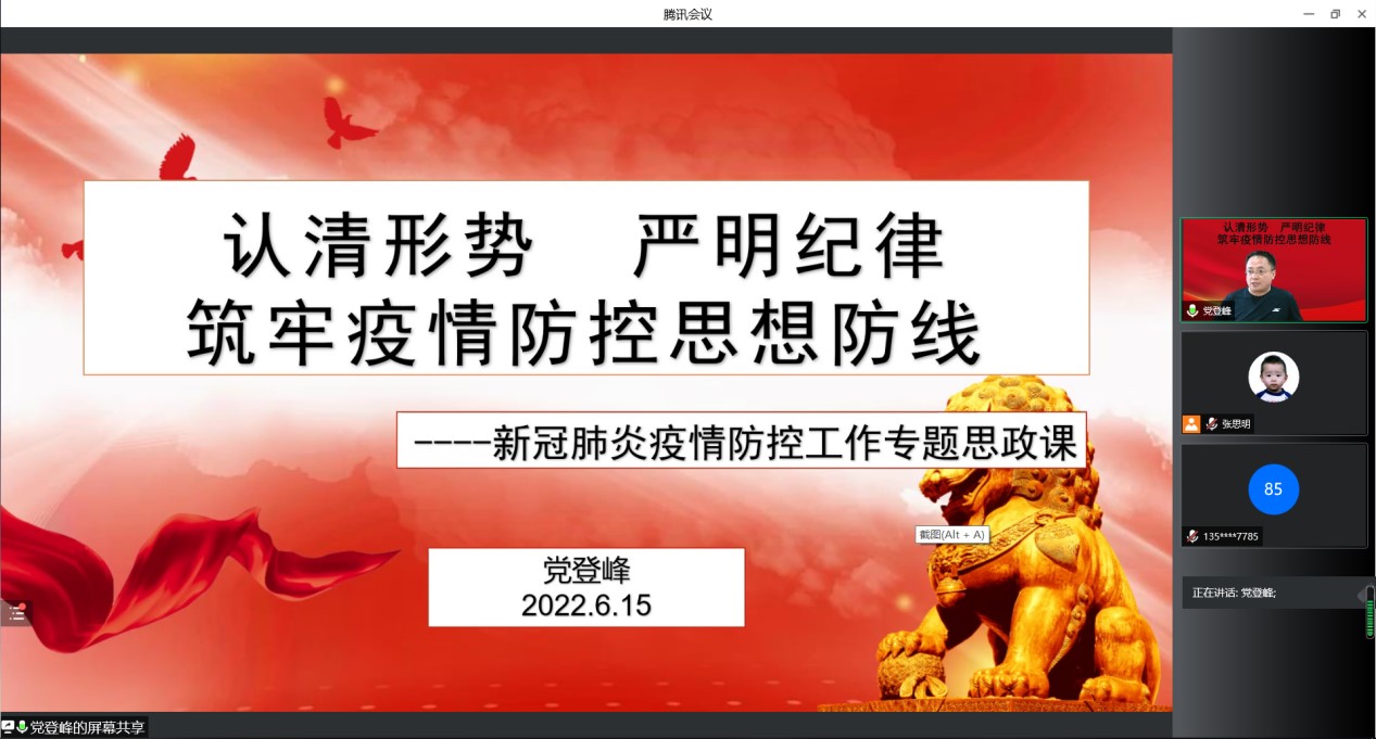 学院党总支书记党登峰以《认清形势,严明纪律,筑牢疫情防控思想防线》为主题,为师生们介绍了近期北京市天堂超市酒吧聚集性疫情相关情况,传达了中央、北京市及学校对此次疫情防控工作的相关要求,要求全体师生认清形势,提高政治站位。通过梳理分析近期发生的几起疫情传播的案例,要求全体师生严明纪律,吸取经验教训,团结一心,再接再厉,配合支持全市和学校的疫情防控工作,坚决打赢疫情防控歼灭战。