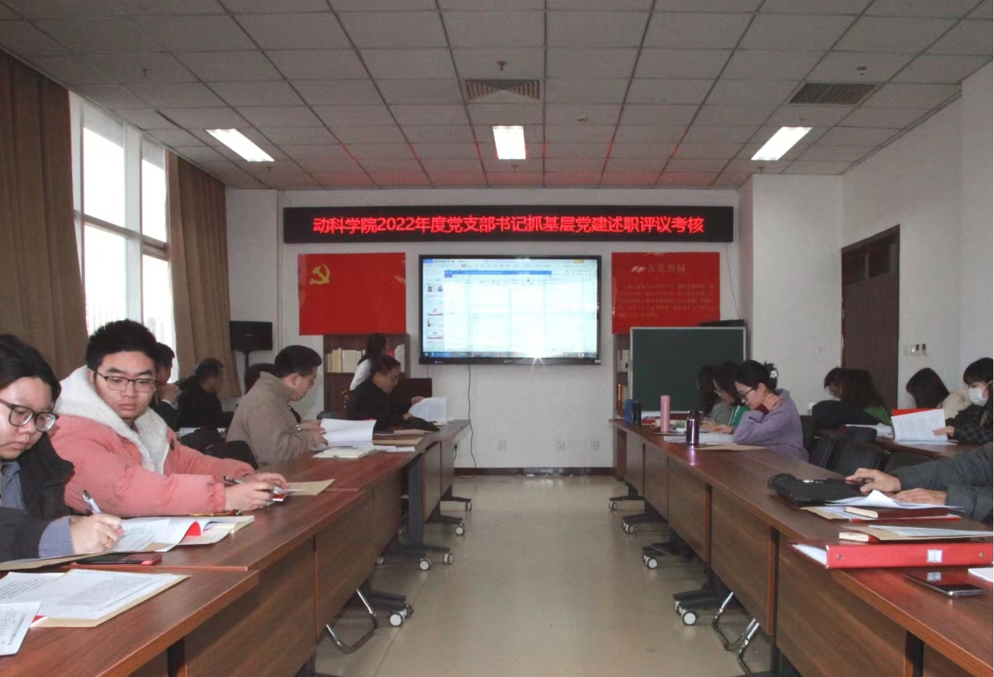 党总支召开2022年度基层党支部书记抓基层党建工作述职评议考核会。学院党总支委员、基层党支部书记、师生党员代表参加会议,会议由党总支书记党登峰主持。
