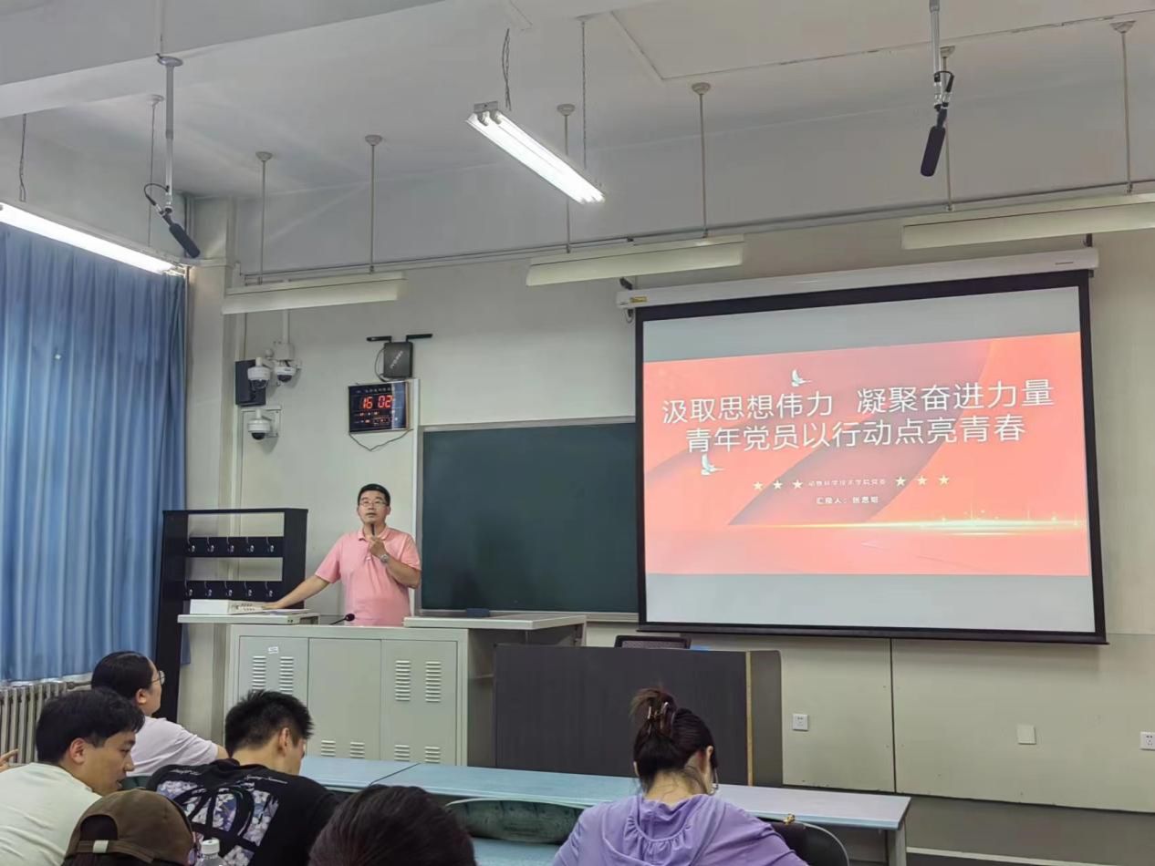 党委副书记、学生工作副院长张思明以“汲取思想伟力 凝聚奋进力量 青年党员以行动点亮青春”为主题,为学生党员讲解了学校迎接本科教育教学审核评估的工作任务,教育引导学生党员要主动学习贯彻习近平新时代中国特色社会主义思想,强化规矩意识,遵守学校各项规章制度,要在关键时刻亮身份,发挥党员的先锋模范作用,共同为学院和学校高质量发展贡献力量。