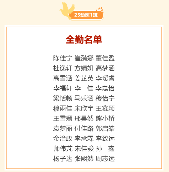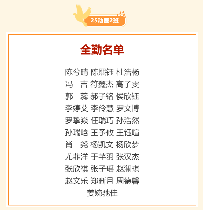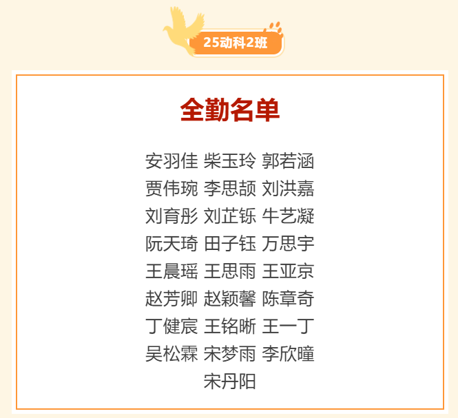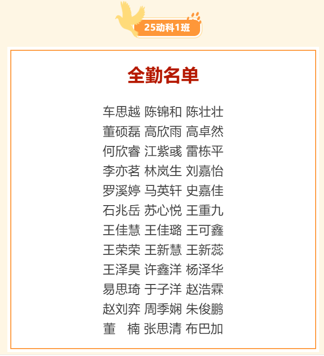 于10月份持续开展25级新生早自习学习活动为巩固新生前期学习成果、强化自主学习意识,进一步浓厚班级互助共进的学习氛围,现对10月份早自习中始终保持全勤、展现出高度自律与良好学风的同学,特别予以表扬。