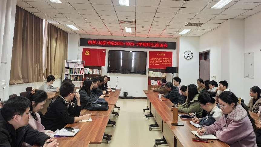 于2025年11月12日中午12:30在动科楼313召开了2025-2026-1学期期中师生座谈会。动科、动医专业各个年级的学生代表、班主任、专业负责人参加了此次会议,校督导何欣、院督导崔德凤应邀出席,会议由教学副院长姚华主持。