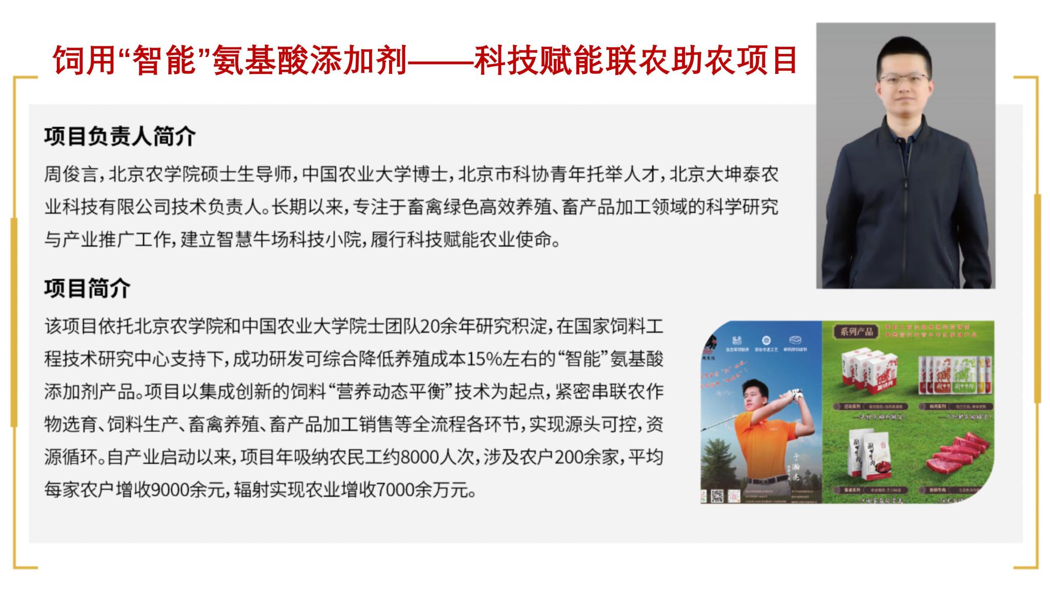 此次周俊言荣获“首都乡村振兴青年先锋”称号,既是对其个人科研实力与助农实绩的高度肯定,更是对高校科技人才扎根乡村、服务“三农”的有力褒奖。饲用“智能”氨基酸添加剂项目,以科技为笔、以产业为纸,将实验室里的科研成果转化为乡村振兴的“金钥匙”,不仅破解了畜禽养殖的饲料成本与粮源安全难题,更构建起全链条农业循环体系,让技术红利实实在在流向农户、惠及乡村。