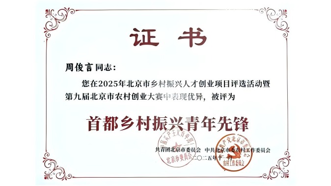 青年教师周俊言在290个农业项目中获得第三名,并被共青团北京市委员会、中共北京市委农村工作委员会联合授予“首都乡村振兴青年先锋”称号。