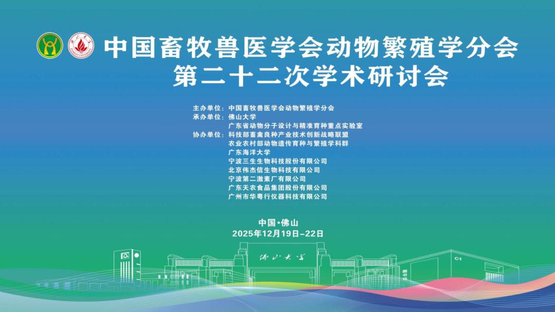 2025年12月19~22日,中国畜牧兽医学会动物繁殖学分会第二十二次学术研讨会在广东省佛山市召开。本次研讨会聚焦动物繁殖领域近年来的基础研究、技术前沿与产业应用,为同行提供高质量的学术交流平台,有效促进学科交流与合作,积极推动我国动物繁殖科研与产业发展。会议由中国畜牧兽医学会动物繁殖学分会主办,佛山大学、广东省动物分子设计与精准育种重点实验室承办。
