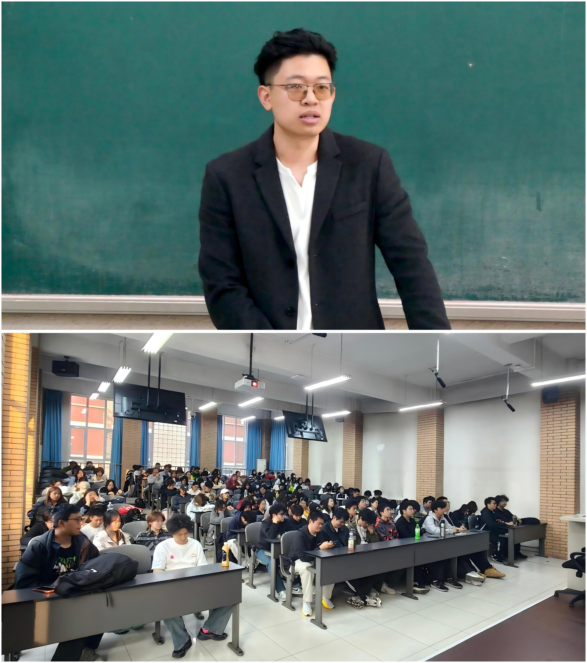 在教B101召开2025级本科生年级大会,会议由辅导员褚思南主持,2025级全体本科生参会。