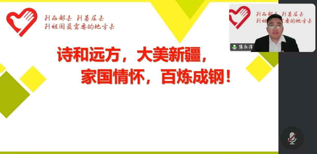 分享环节中,西部计划优秀志愿者代表焦永洋结合自身在服务地的实际经历,从岗前培训、岗位分配到日常服务作了全面讲述。他以真实经历和真挚情感,生动展现了在西部基层锤炼成长的过程,生动讲述了自己的工作感悟,深情分享了在基层服务过程中的历练与收获,传递着志愿服务的温度与力量,为在场同学提供了有价值的实践参考。