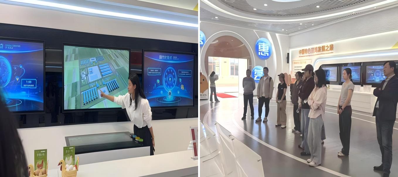随后,师生一行前往北京平谷峪口禽业有限公司,深入了解现代化蛋鸡育种与规模化养殖体系。企业负责人、首席兽医师刘长清与生产部副部长关树勇与中兽医药专版同学们面对面交流,结合养殖生产一线实际,同时详细介绍了企业在养殖过程中面临的常见多发疫病、临床实际病症、防控难点与用药需求,重点分享了企业在畜禽临床防治、提高免疫力、替代抗生素等方面的真实应用场景与效果。